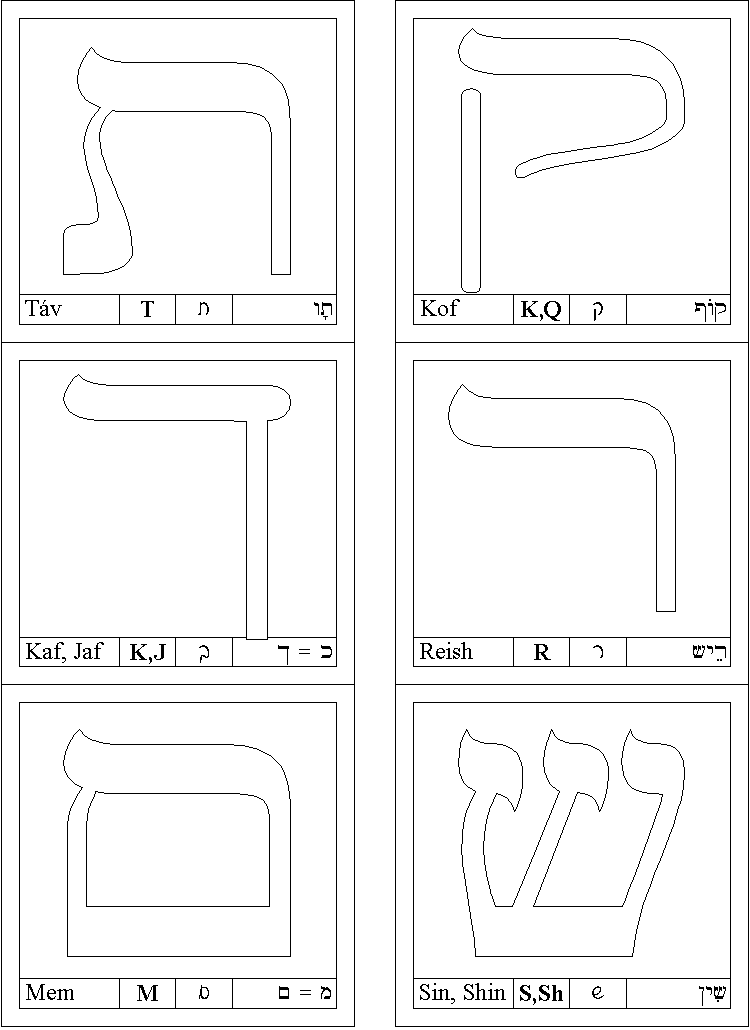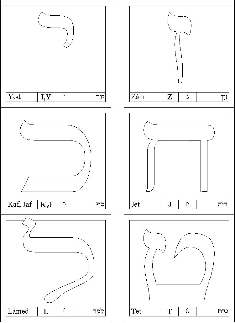 El naipe tiene, arriba y muy grande la letra en Hebreo, Abajo a la derecha e izquierda su nombre en Hebreo y Español, en medio, la letra equivalente aproximada o sonido, y la manuscrita.