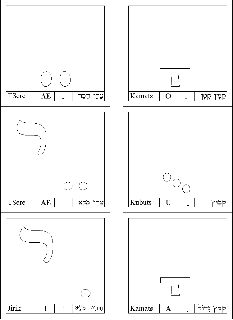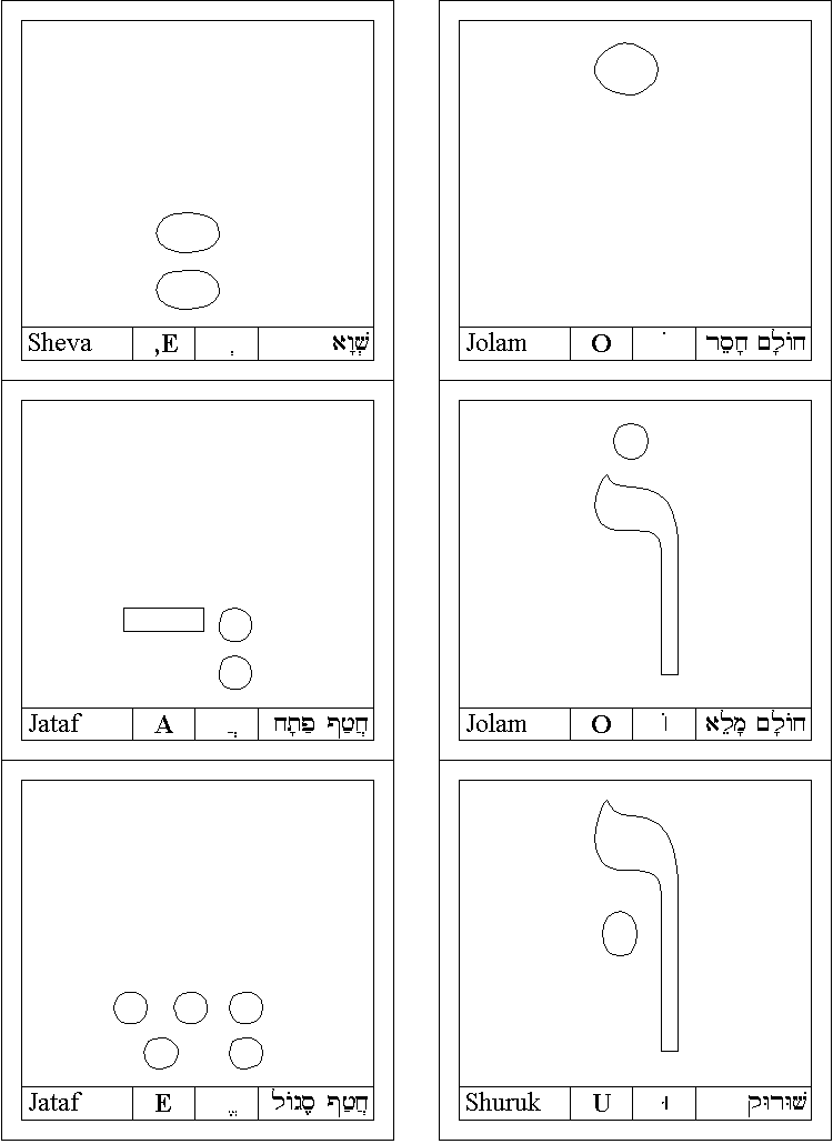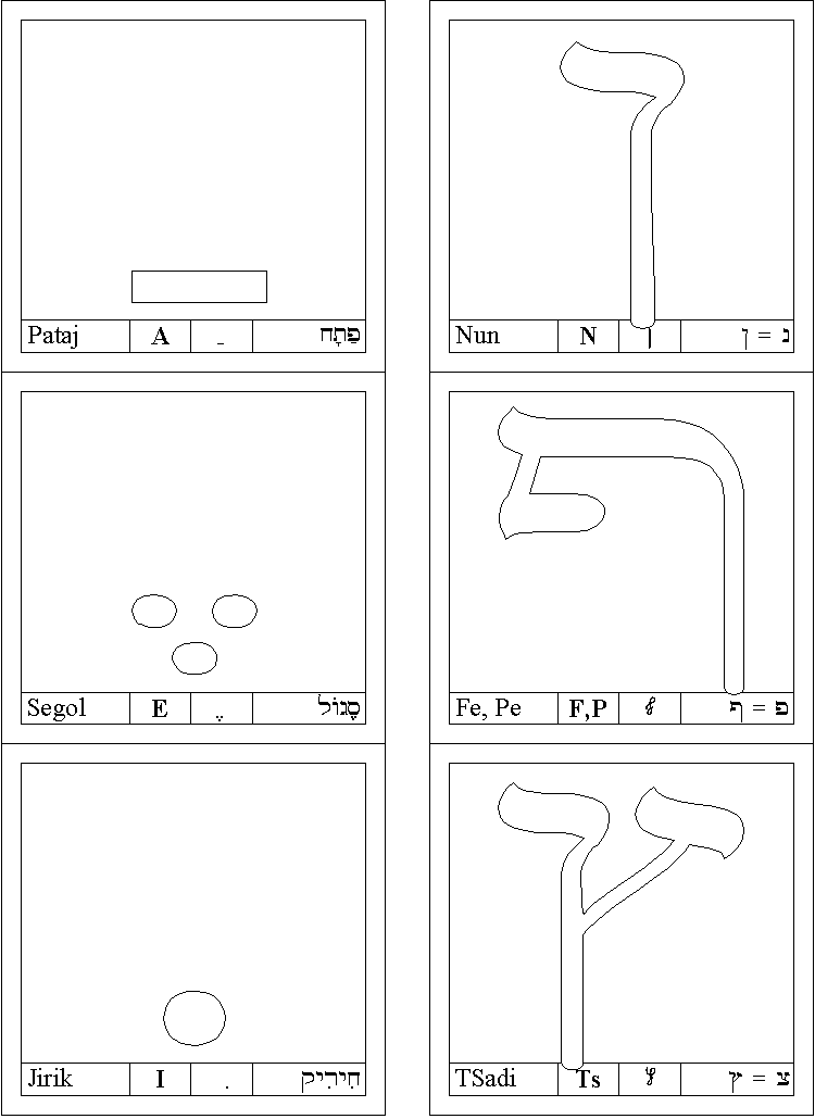 Escoja cualquier palabra en un Sidur, libro, o periódico Israelí acomodar el naipe en la mesa igual que lo escrito, entonces ver la transliteracion o su sonido. Con más práctica, el naipe deja de ser necesario. Es conveniente un Sidur con transliteracion para comprobar.